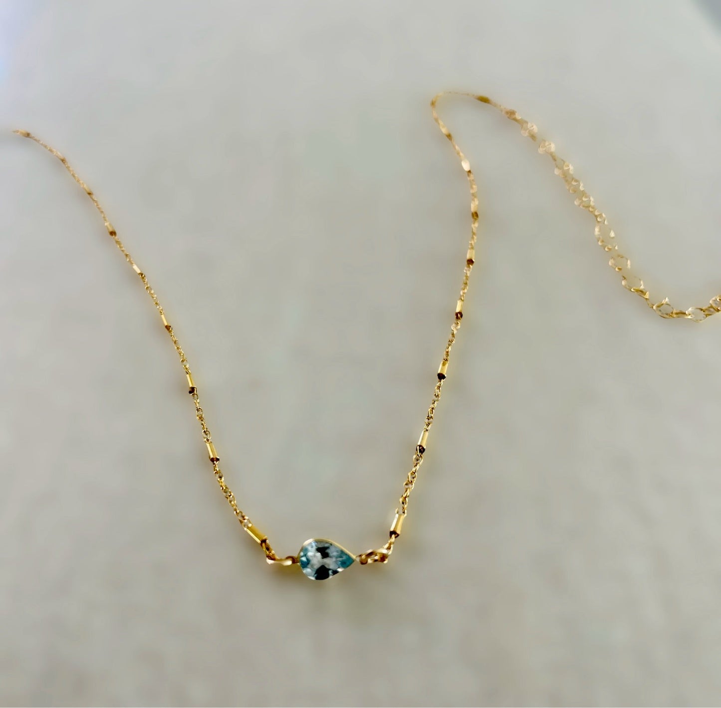 Elegant 7mm blue topaz set in 14kt gold, featuring an adaptable gold-filled chain measuring 13-16.5 inches. Complimentary extension to 18 inches upon request. Sterling Silver variant also available.